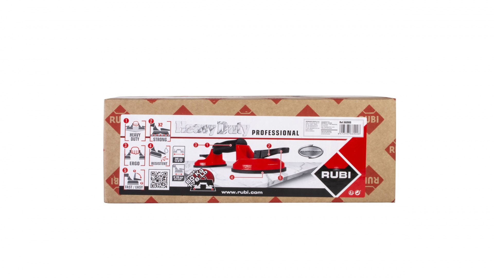 A ventosa dupla da RUBI possui um chassi, de alta resistência, feito de alumínio e uma pega ergonômica para aumentar o conforto durante o manuseio de peças pesadas. Com uma carga máxima de 80 kg, a ventosa dupla RUBI é perfeita para o manuseio de peças cerâmicas extra-grandes, painéis de vidro ou outros elementos.